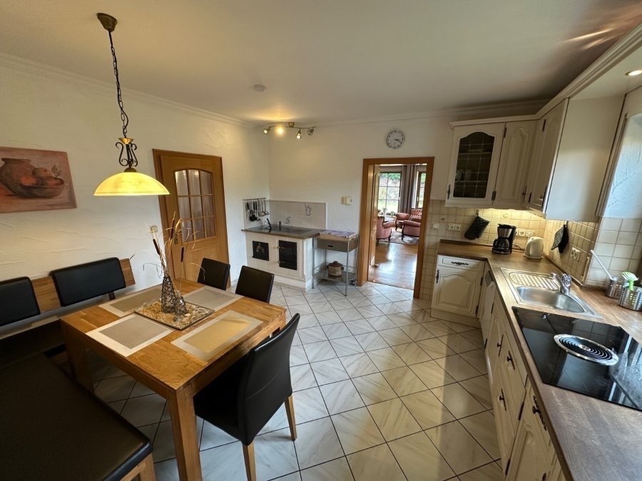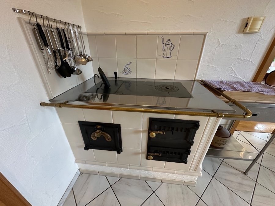 Das großzügige Wohnzimmer mit Kachelofen lädt zum Verweilen ein, während die gemütliche Küche mit originalem Küchenofen besonderen Charme verströmt.